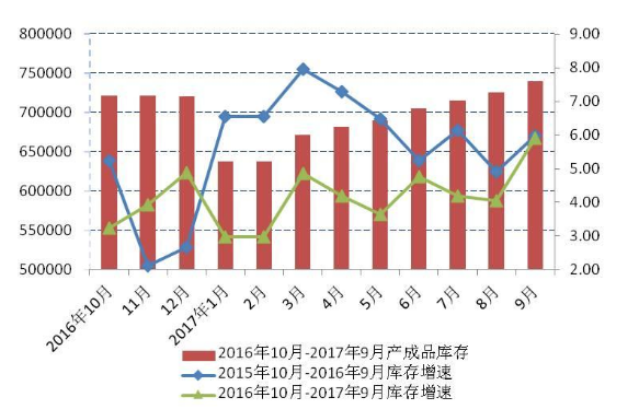 圖2 2016年10月-2017年9月我國化纖長(zhǎng)絲織造加工業(yè)產(chǎn)成品庫存情況(規(guī)模以上)