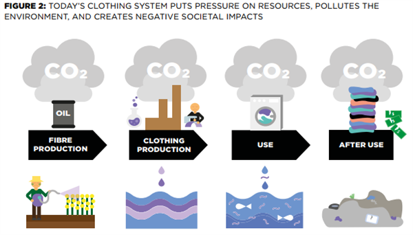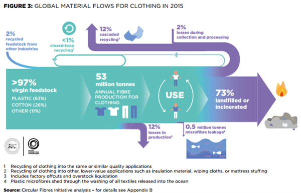 大量的不可再生資源被提取出來,生產(chǎn)出很多經(jīng)常只使用了很短時間的衣服,之后材料大多被送到垃圾填埋場或焚燒。由于服裝利用不足和缺乏回收,每年損失超過5000億美元的價值。