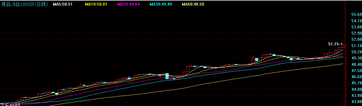 今日中遠(yuǎn)月合約價格繼續(xù)上揚(yáng),代表性180325生絲合約價格繼續(xù)被拉高創(chuàng)出新高。應(yīng)該來說,國儲絲的即將流入市場,符合增加市場供給的初衷,夠下游消化一段時間了,在這段時間內(nèi),國儲絲對市場的補(bǔ)充將起到一定的穩(wěn)定作用,從而影響到盤面的波動。在由蠶繭減產(chǎn)和內(nèi)銷推動的這一輪行情中,我們維持一定程度的樂觀,但仍需注意節(jié)奏的掌控。中國絲綢協(xié)會第七屆會員代表大會暨2017中國絲綢大會將于明天在廣西南寧召開,我們期待行業(yè)的年底盤點(diǎn)。