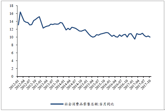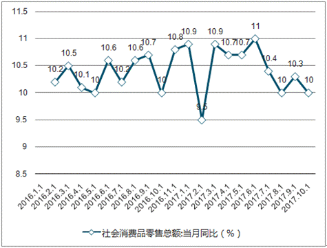 2016年年初至今社會(huì)消費(fèi)品零售總額:當(dāng)月同比(%)