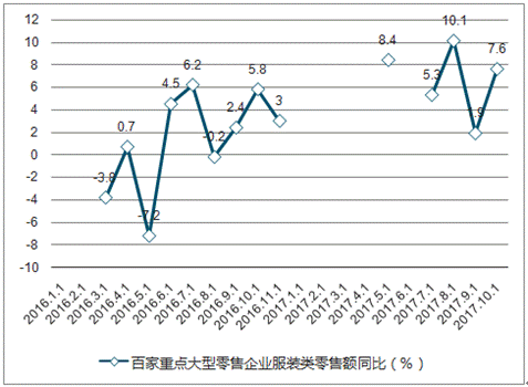 2016年1月至今百家重點(diǎn)大型零售企業(yè)服裝類零售額同比(%)