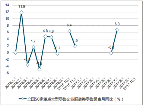 2016年1月至今全國(guó)50家重點(diǎn)大型零售企業(yè)服裝類零售額同比(%)