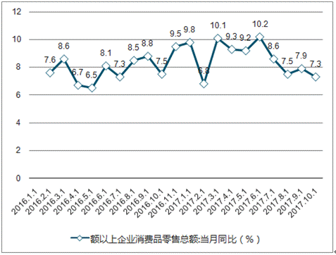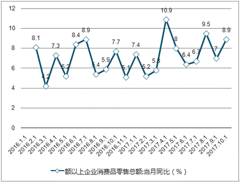 截至2017年10月份,社會(huì)消費(fèi)品零售額總額同比增長(zhǎng)10.0%,限額以上企業(yè)消費(fèi)品零售總額當(dāng)月同比增長(zhǎng)7.3%,截至2017年10月份,限額以上零售額服裝類當(dāng)月同比上漲8.9%。且受益雙節(jié)集中,10月全國(guó)百家重點(diǎn)大型零售企業(yè)服裝零售額同比增長(zhǎng)7.6%,較9月1.9%進(jìn)一步回暖