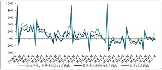 出口方面,紡織品、服裝、鞋類10月同比增速分別為6.83%、-2.84%、-0.75%。2017年前10個(gè)月累計(jì)同比為2.58%、-2.32%、1.74%。