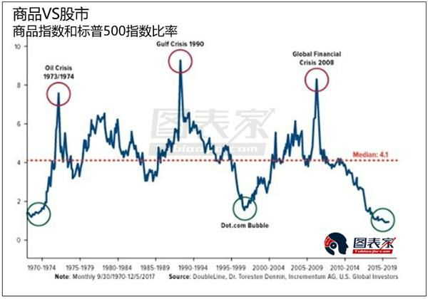 上圖比較了大宗商品和股票的歷史走勢。在1970年,2000年和今天,顯然股票價格已經(jīng)被高估了,而商品則相對而言是被嚴重低估了。