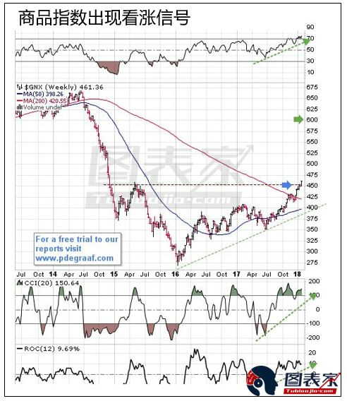技術(shù)層面也出現(xiàn)了令人振奮的消息,圖為GNX商品指數(shù)。該指數(shù)正在突破上方450的前方高點阻力。指數(shù)已經(jīng)突破200周均線,出現(xiàn)強烈看漲信號,這意味著商品從技術(shù)層面來看即將迎來牛市。