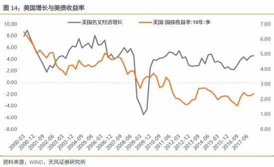 為何2017年Q2以來美債對于加息和縮表的預期都顯得無動于衷?而在近期卻連續(xù)突破心理關口?問題根源在于,美債收益率的變化方向取決于對未來經(jīng)濟增長和通脹的預期,也就是名義GDP的變化,而并非加息與縮表。明白這個道理,就可以看清,為何13年美聯(lián)儲引導QE退出預期、16年產(chǎn)生二次加息預期的時候,美債均快速上揚,但相反,在04-06年連續(xù)加息的時候、在15年首次加息的時候、以及在17年Q2開始連續(xù)引導縮表預期的時候,美債收益率卻并未大幅攀升的原因了。