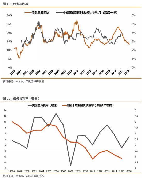 在下面的兩張圖中,我們用月度信貸余額加上月度債券余額計算而得的債務總量的增速代表中國融資需求,用國家總債務的增速代表美國融資需求,可以比較清楚地觀察到融資需求的增速對于十年期國債收益率具有比較好的解釋力和領先性。