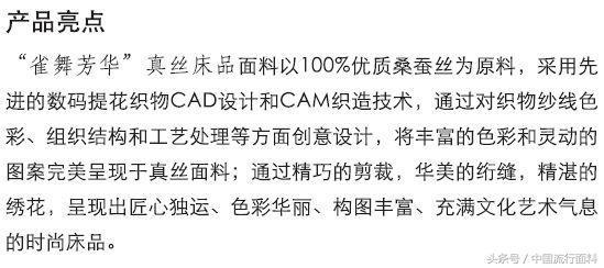 達(dá)利絲綢(浙江)有限公司(簡稱:達(dá)利絲綢),趨勢聯(lián)盟企業(yè),國家絲綢面料流行趨勢研究中心,主營真絲及真絲交織面料,包括真絲彈力、重縐重喬、寬幅數(shù)碼提花面料,可機(jī)洗家紡成品、絲綢領(lǐng)帶、絲巾、真絲服裝及真絲工藝禮品等系列產(chǎn)品;在2017年的創(chuàng)新產(chǎn)品——“雀舞芳華”真絲床品,獲得2017年度紡織十大創(chuàng)新產(chǎn)品榮譽(yù)的“時(shí)尚創(chuàng)意產(chǎn)品”獎。