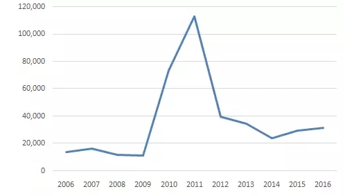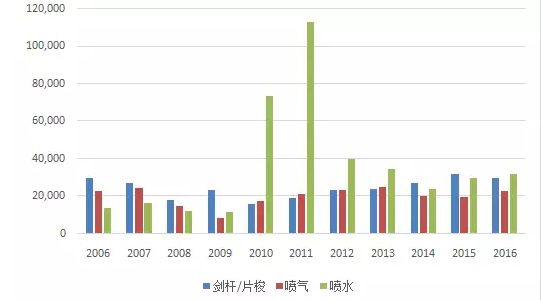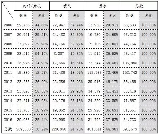 從國(guó)際紡織裝備制造商聯(lián)合會(huì)(ITMF)發(fā)布的數(shù)據(jù)(涵蓋所有國(guó)際知名紡機(jī)企業(yè))來(lái)看,2006年-2016年全球無(wú)梭織機(jī)總交貨量為891,579臺(tái),其中噴水織機(jī)401,041臺(tái),占無(wú)梭織機(jī)總量的44.98%。2006年-2016年國(guó)內(nèi)無(wú)梭織機(jī)總交貨量592,216臺(tái),其中噴水織機(jī)交貨量350,792臺(tái),占無(wú)梭織機(jī)總量的59.23%。