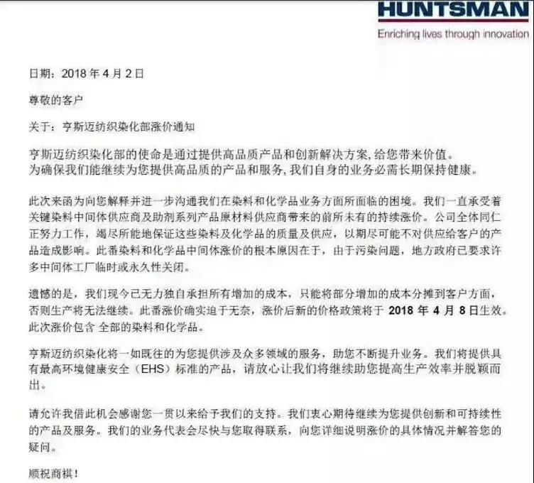 4月2日,代表進(jìn)口染料的亨斯邁公司發(fā)出漲價(jià)通知,此次漲價(jià)包含全部的染料和化學(xué)品,漲價(jià)后新的價(jià)格政策于4月8日生效。