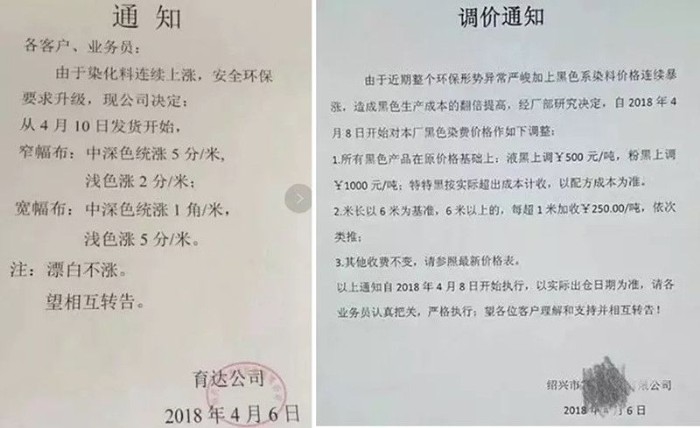 據(jù)公司通告稱,此番染料和化學(xué)品中間體漲價(jià)的根本原因在于,由于污染問題,地方政府已要求許多中間體工廠臨時(shí)或永久性關(guān)閉。因生產(chǎn)成本增加,只能將部分增加的成本分?jǐn)偟娇蛻舴矫?,否則生產(chǎn)將無法繼續(xù)。