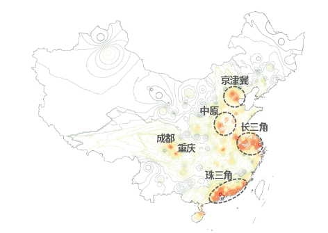 經(jīng)歷過(guò)2016年以前的遷移,人口分布呈現(xiàn)怎樣的特征呢?從2016年我國(guó)人口密度等高線來(lái)看,京津冀、長(zhǎng)三角、珠三角三大城市群的人口密度最高,此外中原地區(qū)人口也較為密集,重慶、成都也存在兩個(gè)人口高密度點(diǎn),可見,人口扎堆聚集在這些區(qū)域。