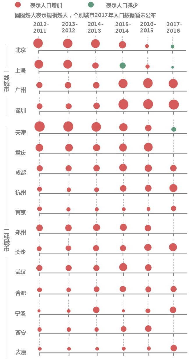 2017年省份+直轄市發(fā)展?jié)摿D注:氣泡大小表示近一年的人口增量,氣泡越大,增量越大,空心氣泡表示人口減少數(shù)據(jù)來(lái)源:省統(tǒng)計(jì)年鑒,城市統(tǒng)計(jì)公報(bào)