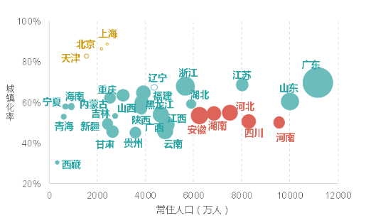 紅色氣泡表示的河南、四川、河北、湖南、安徽五個(gè)省屬于人口規(guī)模較大,在全國(guó)居前列,但城鎮(zhèn)化率并不高(低于全國(guó)平均城鎮(zhèn)化率水平)的省份,這類省份的人口優(yōu)勢(shì)在未來(lái)會(huì)得到進(jìn)一步顯現(xiàn),這五個(gè)省的省會(huì)城市也是我們認(rèn)為未來(lái)會(huì)有大量人口流入的城市。