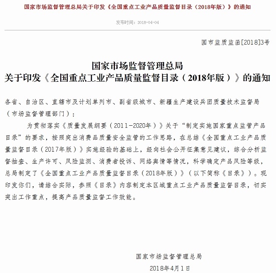 近日,國家市場監(jiān)督管理總局發(fā)布關(guān)于印發(fā)《全國重點工業(yè)產(chǎn)品質(zhì)量監(jiān)督目錄(2018年版)》的通知,要求各省、自治區(qū)、直轄市及計劃單列市、副省級城市、新疆生產(chǎn)建設(shè)兵團質(zhì)量技術(shù)監(jiān)督局(市場監(jiān)督管理部門)結(jié)合實際,參照《目錄》內(nèi)容制定本區(qū)域重點工業(yè)產(chǎn)品質(zhì)量監(jiān)督目錄,切實突出工作重點,提高產(chǎn)品質(zhì)量監(jiān)督工作效能。