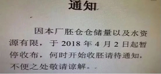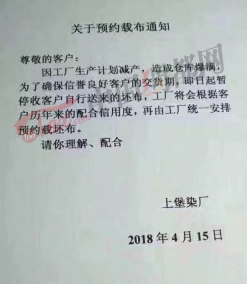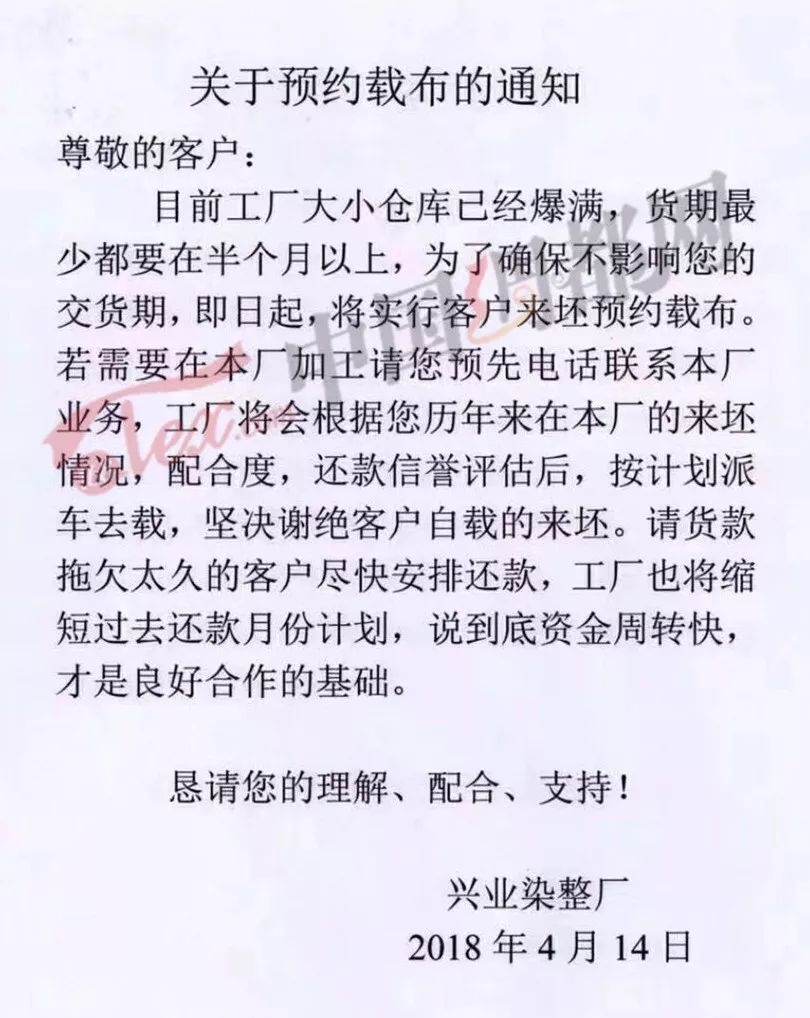根據(jù)通知,由于染廠爆倉(cāng),客戶自行載來(lái)的坯布一律拒收,染廠方面將根據(jù)客戶登記信息、信譽(yù)程度等安排載布計(jì)劃。