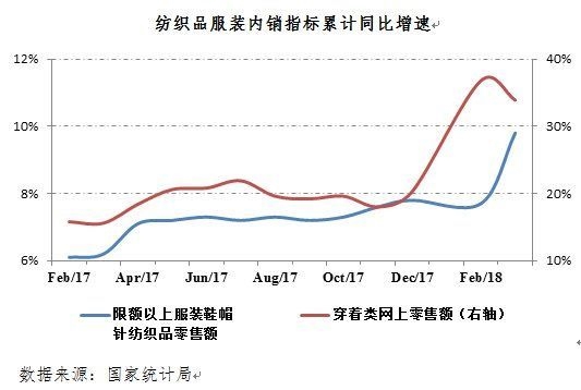 2018年一季度,我國紡織品服裝內(nèi)需市場(chǎng)增長(zhǎng)加快,網(wǎng)絡(luò)渠道銷售增速提升明顯。根據(jù)國家統(tǒng)計(jì)局?jǐn)?shù)據(jù),全國限額以上服裝鞋帽針紡織品零售額同比增長(zhǎng)9.8%,較上年同期提高3.6個(gè)百分點(diǎn),且增速提升至與同期全社會(huì)消費(fèi)品零售總額增速相當(dāng),這是近年來較為少見的情況;網(wǎng)上穿著類商品零售額同比增長(zhǎng)33.9%,較上年同期大幅提高18.3個(gè)百分點(diǎn)。