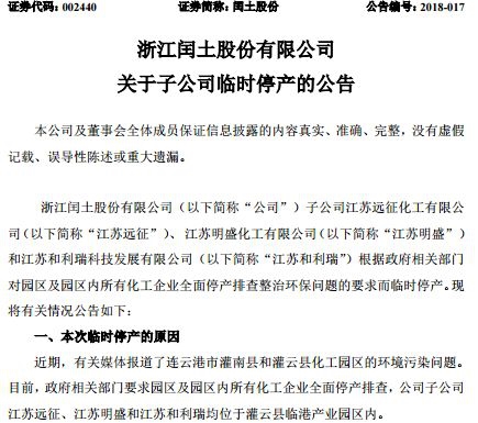閏土股份涉及停產(chǎn)的3家子公司:江蘇遠征化工有限公司、江蘇明盛化工有限公司、江蘇和利瑞科技發(fā)展有限公司;