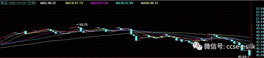 今日(周五)中國繭絲綢交易市場生絲指數(shù)下跌1.13%報(bào)收于4665.80點(diǎn)。B絲(3A級生絲):180525(合同約定的交收日)下跌7800元報(bào)47.28萬,180925(合同約定的交收日)下跌8400報(bào)45.72萬。干繭盤面繼續(xù)上漲價(jià)值回歸。本周生絲指數(shù)以陰線報(bào)收。