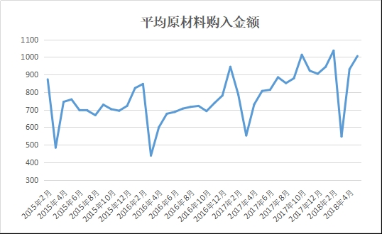 平均原材料購入金額顯示當(dāng)月企業(yè)采購情況以及生產(chǎn)積極性。從平均原材料購入金額走勢圖上看,4月份“50企業(yè)”平均原材料購入金額收于1005.551,相比3月上漲了75.097,漲幅為8.1%。4月是傳統(tǒng)產(chǎn)銷旺季,因市場火爆,滌綸長絲價(jià)格較上月略有上升,以FDY 150D為例,4月底滌綸長絲價(jià)格較上月底上漲了430元/噸,但錦綸本月價(jià)格略有下跌,總體原料上升幅度不大。