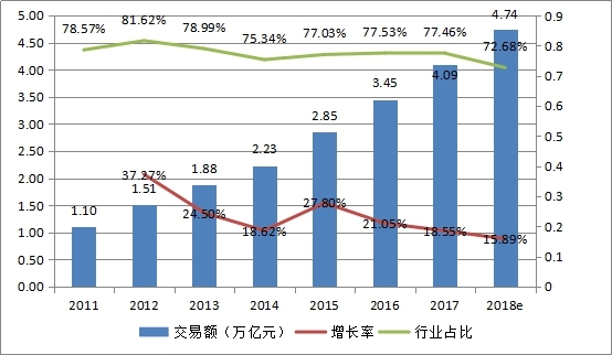 圖2:2011-2017行業(yè)B2B電子商務(wù)交易額情況