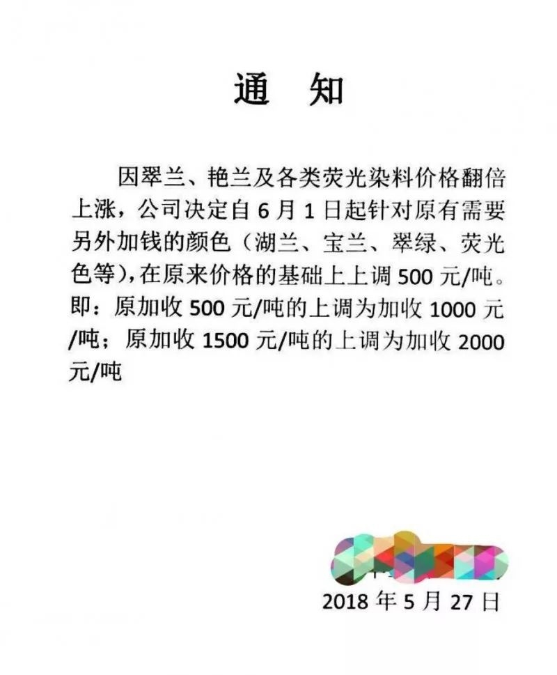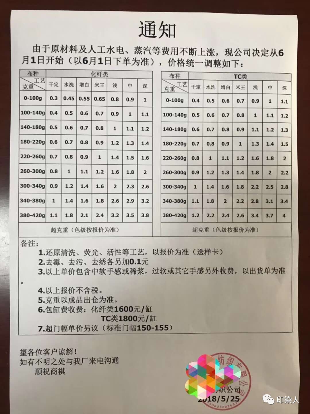 染整加工費(fèi)漲價(jià)通知及明細(xì)