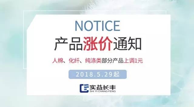 非常感謝您一直以來對(duì)實(shí)益長(zhǎng)豐的支持和信賴。由于近期生產(chǎn)成本攀升,為緩解生產(chǎn)壓力,我司自5月29日起,對(duì)人棉類、化纖類、純滌類部分產(chǎn)品上調(diào)1元/kg!