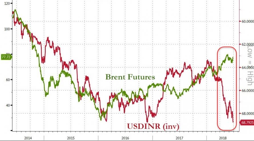 印度盧比兌美元匯率創(chuàng)歷史新低,因近日大幅反彈的油價加劇投資者對新興市場經(jīng)濟基本面的擔憂。而印度依靠進口來滿足約80%的能源需求,因此特別容易受到油價波動的沖擊。
