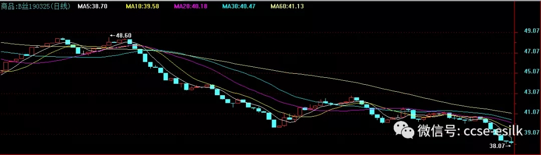 今日(周四)中國繭絲綢交易市場生絲指數(shù)下跌0.74%報收于3837.84點。B絲(3A級生絲):181025(合同約定的交收日)下跌600元報38.25萬元,190325(合同約定的交收日)下跌1500元報38.19萬元,190925上漲300元報38.58萬元。干繭盤面跟隨波動。