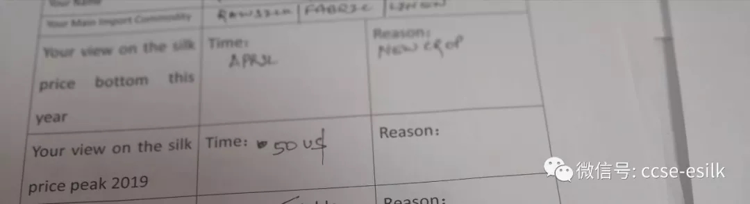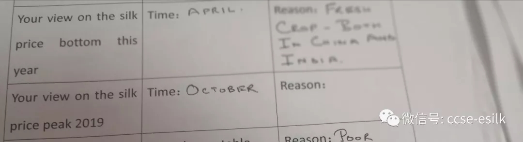 金蠶網(wǎng)在上月香港的絲綢交易會上發(fā)放了問卷調查表,其中有8位印度客商填寫了調查表,基本表示他們認為在中國春繭上市前后會出現(xiàn)了一個價格的低點,一方面這是他們進口的淡季,另一方面這種認識也部分造成了他們暫時的延期下單。