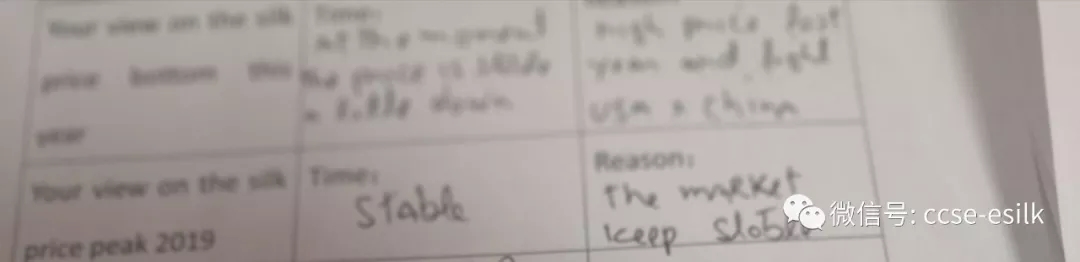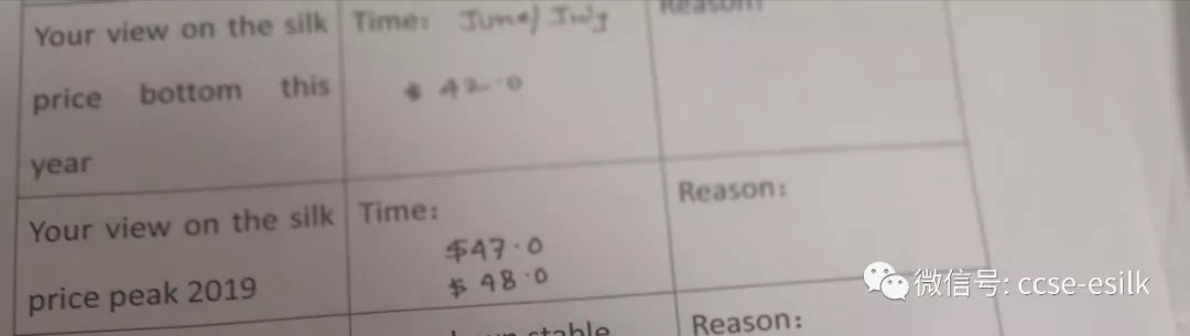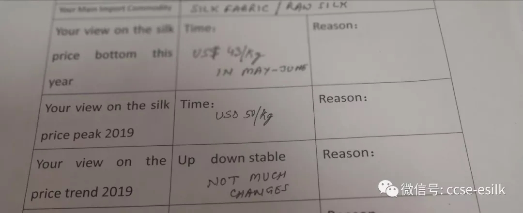 這位客商認為春繭前價格持平或略低一點,原因是去年價格一路走跌和中美貿易戰(zhàn)的進展。他認為今年的價格走勢應該是平穩(wěn)為主,原因是今年的市場需求平穩(wěn)。