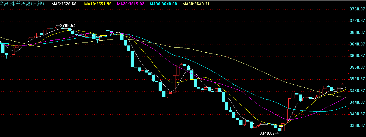 今日盤面處于橫盤整理狀態(tài),生絲指數(shù)技術(shù)形態(tài)維持較好。廣西多地第三批蠶繭上市基本結(jié)束,整體第三批的收購繭本拉高,本周現(xiàn)貨33.5萬以下的3A級商檢廠絲偏少。嘉湖地區(qū)各等級各個產(chǎn)區(qū)(包括進口綿)絲綿及打綿繭近日成交活躍度提高。