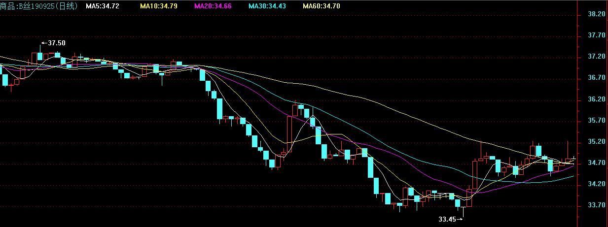 今日(2019年6月12日,周三)中國繭絲綢交易市場生絲指數(shù)微漲0.04%報收于3514.28點。B絲(3A級生絲):190625(合同約定的交收日)下跌300元報33.78萬元,190925平報34.83萬元,200325合約下跌1200元報36.63萬元。