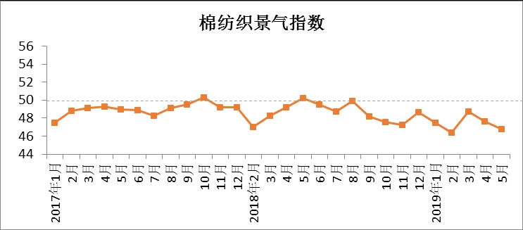 2019年5月中國棉紡織景氣指數(shù)46.82,與4月相比下降0.81。5月,儲備棉輪出正式開始,由于前期市場等待拋儲,部分紡中低支紗企業(yè)原料庫存處于低位,因此儲備棉輪出首周成交率高企。5月8日,中美貿(mào)易摩擦再度升級,市場觀望情緒從終端不斷向上游傳導(dǎo),產(chǎn)業(yè)鏈各環(huán)節(jié)企業(yè)均不敢下單,導(dǎo)致市場供大于求,原料、產(chǎn)品價格不斷下跌,企業(yè)庫存增加,市場活力下降,企業(yè)家經(jīng)營信心受到?jīng)_擊,行業(yè)景氣度下滑。6月,下游市場并無明顯改善,美國擬對3000億美元中國輸美產(chǎn)品征加關(guān)稅聽證會以及G20峰會中美雙方領(lǐng)導(dǎo)談判結(jié)果成為行業(yè)關(guān)注的焦點。因此,在沒有相關(guān)利好消息公布前,預(yù)計行業(yè)景氣度依然不高。