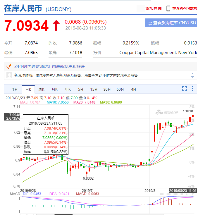 離岸人民幣走弱 現(xiàn)報(bào)7.0988日內(nèi)貶值逾100點(diǎn)