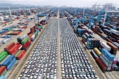 圖為日前出口馬來西亞的國產(chǎn)汽車在寧波舟山港等待裝船。