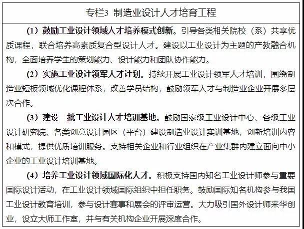 工業(yè)和信息化部、國(guó)家發(fā)展和改革委員會(huì)等十三部門印發(fā)《制造業(yè)設(shè)計(jì)能力提升專項(xiàng)行動(dòng)計(jì)劃(2019-2022年)》,明確爭(zhēng)取用4年左右的時(shí)間,推動(dòng)制造業(yè)短板領(lǐng)域設(shè)計(jì)問(wèn)題有效改善,工業(yè)設(shè)計(jì)基礎(chǔ)研究體系逐步完備,公共服務(wù)能力大幅提升,人才培養(yǎng)模式創(chuàng)新發(fā)展。創(chuàng)建10個(gè)左右以設(shè)計(jì)服務(wù)為特色的服務(wù)型制造示范城市,發(fā)展壯大200家以上國(guó)家級(jí)工業(yè)設(shè)計(jì)中心,打造設(shè)計(jì)創(chuàng)新骨干力量,引領(lǐng)工業(yè)設(shè)計(jì)發(fā)展趨勢(shì)。推廣工業(yè)設(shè)計(jì)“新工科”教育模式,創(chuàng)新設(shè)計(jì)人才培養(yǎng)方式,創(chuàng)建100個(gè)左右制造業(yè)設(shè)計(jì)培訓(xùn)基地。