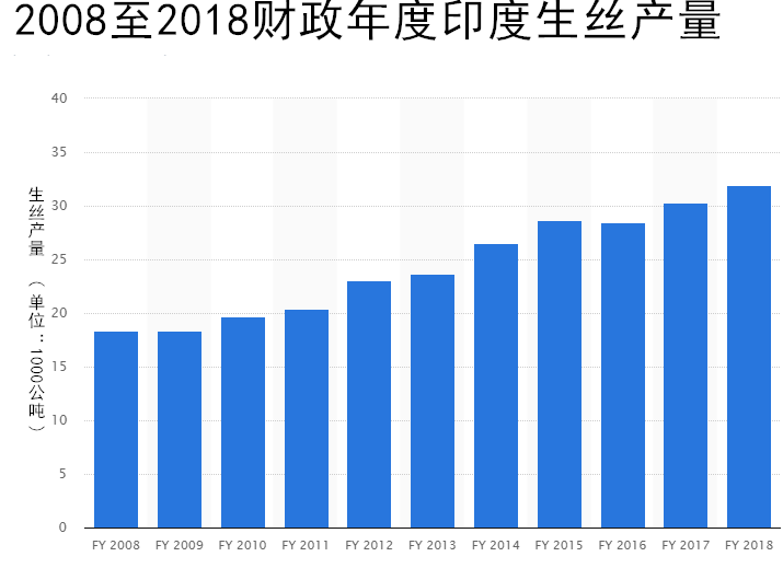 這一統(tǒng)計數(shù)據(jù)顯示了2008至2018年印度生絲生產(chǎn)總量。2018年財政年度,印度生絲產(chǎn)量約為3.2萬公噸,比上一個財政年度有所增加。