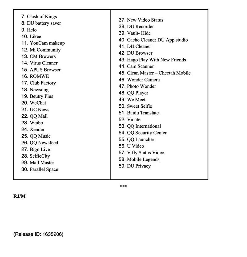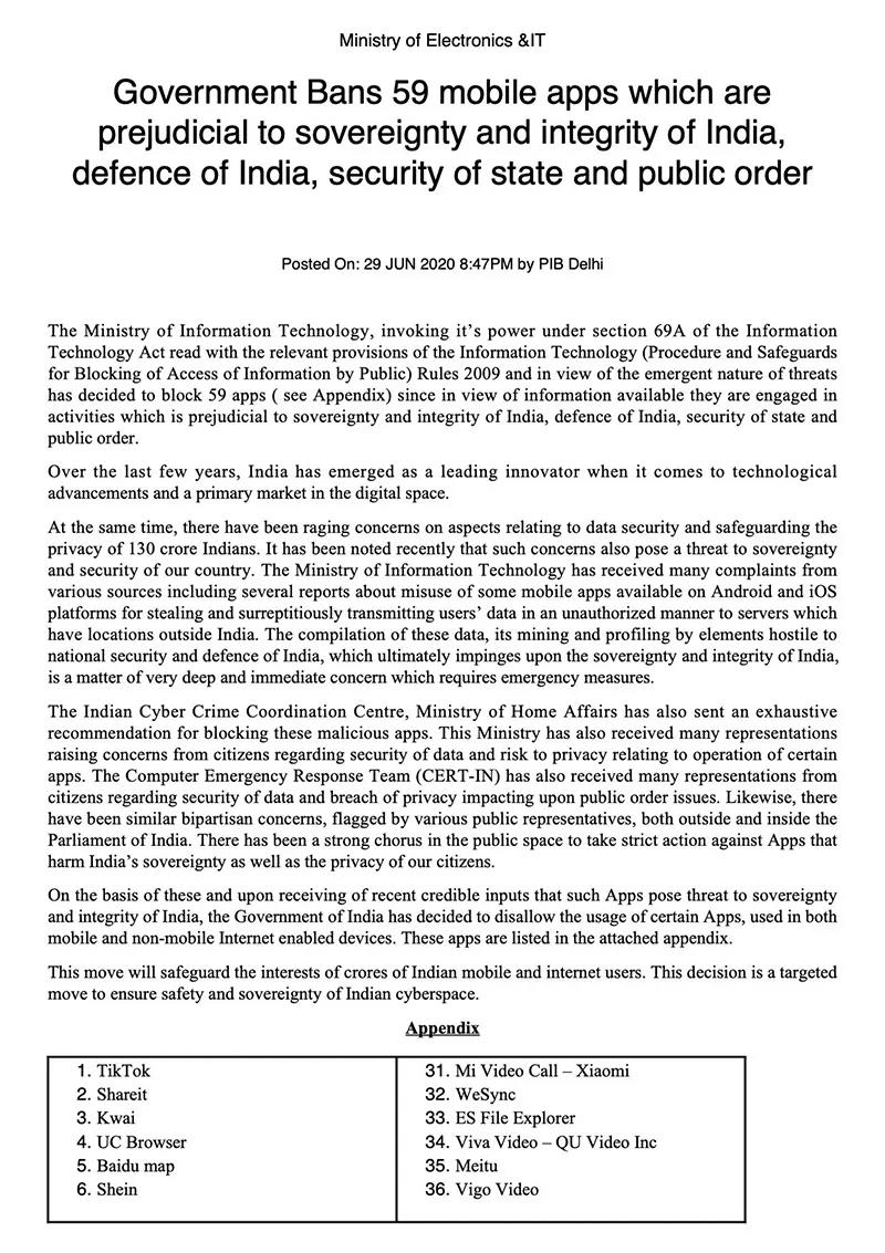 基于這些和最近收到的可靠消息,這些應(yīng)用對(duì)印度的主權(quán)和完整構(gòu)成威脅,印度政府決定禁止在移動(dòng)和非移動(dòng)互聯(lián)網(wǎng)設(shè)備使用某些應(yīng)用。這些應(yīng)用程序已列在附件中。此舉將保護(hù)印度移動(dòng)和互聯(lián)網(wǎng)用戶的利益。這一決定是為確保印度網(wǎng)絡(luò)安全和主權(quán)而采取的有針對(duì)性的措施。