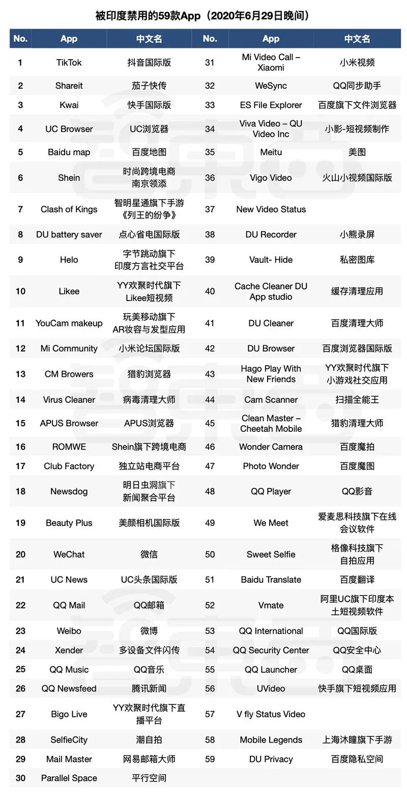 《政府禁止59款對(duì)印度主權(quán)和完整、國(guó)防、國(guó)家安全和公共秩序有害的手機(jī)應(yīng)用》