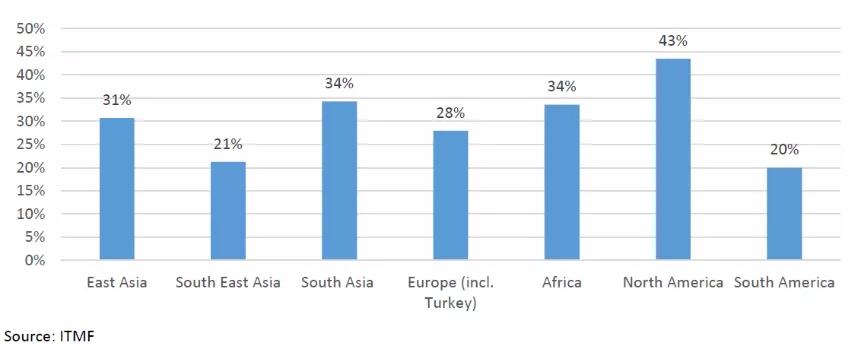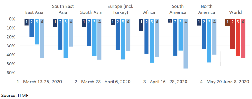 在全球范圍內(nèi),當(dāng)前訂單繼續(xù)平均下降超過40%(圖1)。訂單取消和推遲比列在30%(東南亞)和55%(南美)之間。
