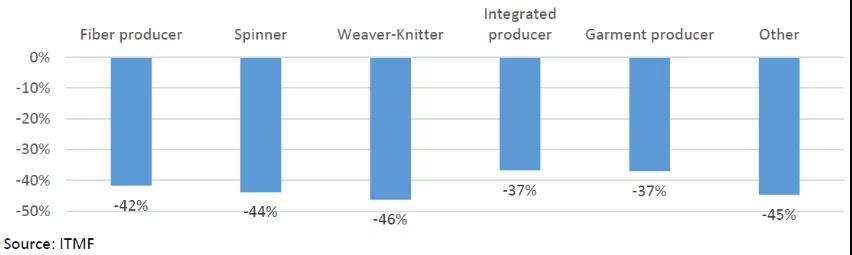 圖2:全球紡織品價值鏈所有生產(chǎn)部門訂單減少幅度在37%和46%之間。