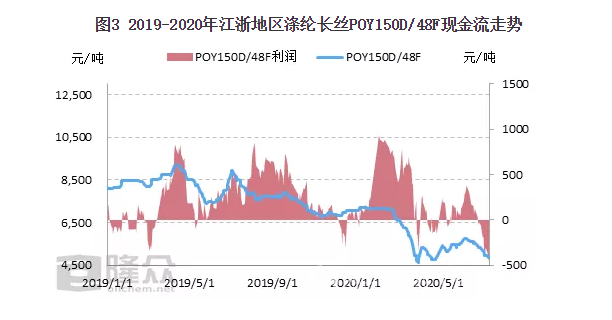 圖3 2019-2020年江浙地區(qū)滌綸長絲POY150D/48F現金流走勢