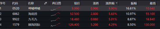 餐飲股集體飆升,呷哺呷哺(9.99, 0.90, 9.90%)漲10%,海底撈(52.5, 2.80, 5.63%)漲5.6%,再創(chuàng)新高,九毛九(18.46, 0.88, 5.01%)漲5%,頤海國際(126.4, 5.20, 4.29%)漲4%。業(yè)內(nèi)人士認(rèn)為,隨著下半年餐飲行業(yè)進(jìn)入旺季,頭部的餐飲企業(yè)享受資本的紅利屬于正?,F(xiàn)象。相比之下,中小餐飲企業(yè)則迎來了“關(guān)店潮”。大型的龍頭餐飲企業(yè)在品牌、資金、供應(yīng)鏈和抗風(fēng)險(xiǎn)能力等方面的實(shí)力,是中小餐飲企業(yè)所無法比擬的。也正因此,在疫情期間,龍頭餐飲企業(yè)得以繼續(xù)擴(kuò)張。