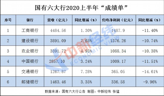 中新經緯客戶端8月31日電 (張猛) 30日,國有六大行2020年半年報悉數(shù)出爐。半年報顯示,國有六大行上半年營收均有所提升,但凈利潤集體下滑。