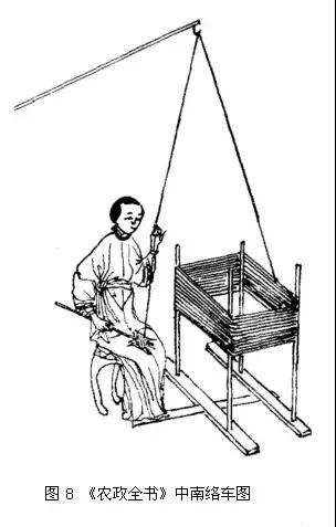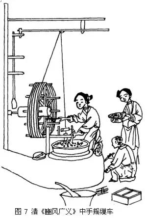 繅車發(fā)明以前,繅絲時(shí)的繞絲工具,最初大概只是簡(jiǎn)單的H型架子,戰(zhàn)國(guó)時(shí)改進(jìn)成轆轤式的繅絲軖〔kuang框〕??壗z軖是手搖繅車的雛形,用竹制成,四角或六角,用短輻交互連接,中貫以軸,使用時(shí)放在繅釜上面,用時(shí)直接拔動(dòng)使之不斷回轉(zhuǎn),將繅釜中引出的絲條,直接纏繞在軖框上。秦漢以后,成形的手搖繅車才出現(xiàn)。唐代手搖繅車的使用已相當(dāng)普遍,唐詩(shī)中就曾多處出現(xiàn)過(guò)繅車的記載,如陸龜蒙詩(shī)句“每和煙雨掉(搖)繅車”,描述了陰雨天里繅婦忙著搖動(dòng)絲車的勞動(dòng)情景;王建詩(shī)句“檐頭索索繰(繅)車?guó)Q”,講繅車轉(zhuǎn)動(dòng)后發(fā)出索索之鳴響。宋代手搖繅車得到進(jìn)一步完善,并出現(xiàn)了有關(guān)具體形制的記載,其制據(jù)秦觀《蠶書(shū)》介紹,系由灶、鍋、錢眼(作用是合并緒絲)、鎖星(導(dǎo)絲滑輪,并有消除絲縷上纇〔lei類〕節(jié)的作用)、添梯(使絲分層卷繞在絲框上的橫動(dòng)導(dǎo)絲桿)、絲鉤、絲軖、車架等部分組成??壡?,須將繭鍋里的絲先穿過(guò)集緒的“錢眼”,繞過(guò)導(dǎo)絲滑輪“鎖星”,再通過(guò)橫動(dòng)導(dǎo)絲桿“添梯”和送絲鉤,繞在絲軖上??墪r(shí),須兩人合作,一人投繭索緒添緒,一人手搖絲軖。元代初年,生產(chǎn)效率遠(yuǎn)較手搖繅車高出許多的腳踏紡車開(kāi)始普及,手搖繅車在各地的使用日漸減少,但由于它結(jié)構(gòu)簡(jiǎn)單,易于操作,有的地方仍在沿用,故清代《豳風(fēng)廣義》和《蠶桑萃編》兩書(shū),仍把手搖繅車作為一種有效的繅絲工具予以介紹(圖7)。
