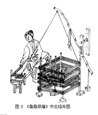絡(luò)車是將繅車上脫下的絲絞轉(zhuǎn)絡(luò)到絲籰上的機(jī)具,它有南北絡(luò)車之分(圖8、圖9)。關(guān)于絡(luò)車的記載,《方言》有“河濟(jì)之間,絡(luò)謂之給”。郭璞注“所以轉(zhuǎn)籰給事也”?!墩f(shuō)文》有“車柎〔fu膚〕為柅〔ni你〕”。《通俗文》有“張絲曰柅”。這里的“柅”南北絡(luò)車通用,是張絲絞的裝置,由豎立地面上的四根木棍,或者由每?jī)筛唤M下裝底座的木棍組成。王禎《農(nóng)書(shū)》對(duì)北絡(luò)車的構(gòu)造和用法記載得比較詳細(xì),其文譯成白話是:將繅車上脫下的絲膠,張于“柅”上,“柅”上作一懸鉤,引絲緒過(guò)鉤后,逗于車上。其車之制,是以細(xì)軸穿籰,放于車座上的兩柱之間。兩柱一高一低,高柱上有一通槽,放籰軸的前端,低柱(上有一孔)放籰軸的末端。繩兜繞在籰軸上,手拉繩一引一放,則籰軸隨轉(zhuǎn),絲于是就絡(luò)在籰上了。宋應(yīng)星《天工開(kāi)物》則對(duì)南絡(luò)車的構(gòu)造和用法記載得較具體,其文譯成白話是:在光線好的屋檐下,把木架鋪在地上,木架上插四根竹竿,名叫“絡(luò)篤”。絲套在四根竹上。絡(luò)篤旁邊的立柱上八尺高處,斜安一小竹竿,上面裝一個(gè)月牙鉤,絲懸掛在鉤內(nèi)。手拿籰子旋轉(zhuǎn)繞絲,以備牽經(jīng)卷緯時(shí)用。小竹竿的一頭墜石,成為活頭,接斷絲時(shí),一拉繩小鉤就可落下。對(duì)比兩書(shū)記載,南北絡(luò)車都用張絲的“柅”和卷繞絲線的“籰”,但絲上籰的方式兩者卻是大不相同。北絡(luò)車是用右手牽繩掉籰,左手理絲,繞到籰上;南絡(luò)車則是用右手拋籰,左手理絲,繞到籰上。由于北絡(luò)車轉(zhuǎn)籰動(dòng)作采取了機(jī)械方式,絲籰旋轉(zhuǎn)速度快而穩(wěn),所以它的生產(chǎn)效率和絡(luò)絲質(zhì)量遠(yuǎn)較南絡(luò)車為優(yōu),古人所謂“南人掉籰取絲,終不若絡(luò)車安而穩(wěn)也”的評(píng)論,正是對(duì)此而言。