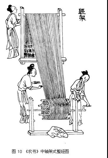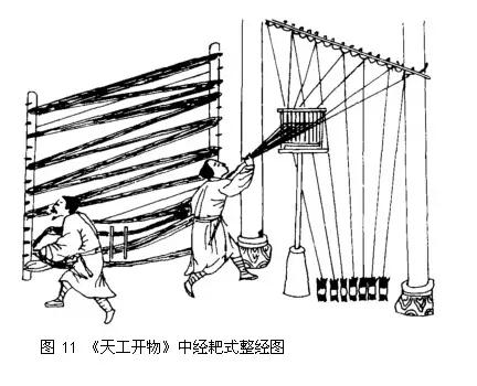 軸架式整經(jīng)工具始見(jiàn)于樓璹〔shu贖〕《耕織圖》中,那上面所載圖文雖過(guò)于簡(jiǎn)單,但表明至晚在南宋時(shí)就已普遍使用這種整經(jīng)工具了。其后元代的《農(nóng)書(shū)》、明代的《農(nóng)政全書(shū)》、清代的《豳風(fēng)廣義》等一些書(shū)籍記載得較為詳盡,使我們可以知道它的全貌。根據(jù)這些記載,軸架式整經(jīng)是將絲籰整齊排列在一有小環(huán)的橫木下,引出絲緒穿過(guò)小環(huán)和掌扇繞在經(jīng)架上(經(jīng)架的形制是兩柱之間架一大絲框,框軸固連一手柄)。一人轉(zhuǎn)動(dòng)經(jīng)架上手柄,一人用掌扇理通紐結(jié)經(jīng)絲,使絲均勻地繞在大絲框上后,再翻卷在經(jīng)軸上(圖11)。這種經(jīng)具與經(jīng)耙式相比,不僅產(chǎn)量高、質(zhì)量有保證,而且對(duì)棉、毛、絲、麻等纖維都適用,故一直習(xí)用至近代。它的工作原理與近代大圓框式的自動(dòng)整經(jīng)機(jī)完全一致。