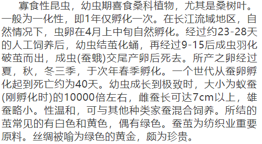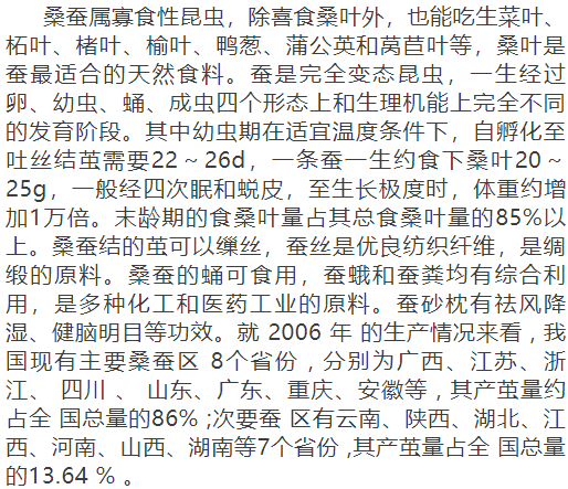 桑蠶起源于中國,它發(fā)育溫度是7~40℃,飼育適溫為20~25℃,主要分布在溫帶、亞熱帶和熱帶地區(qū)。